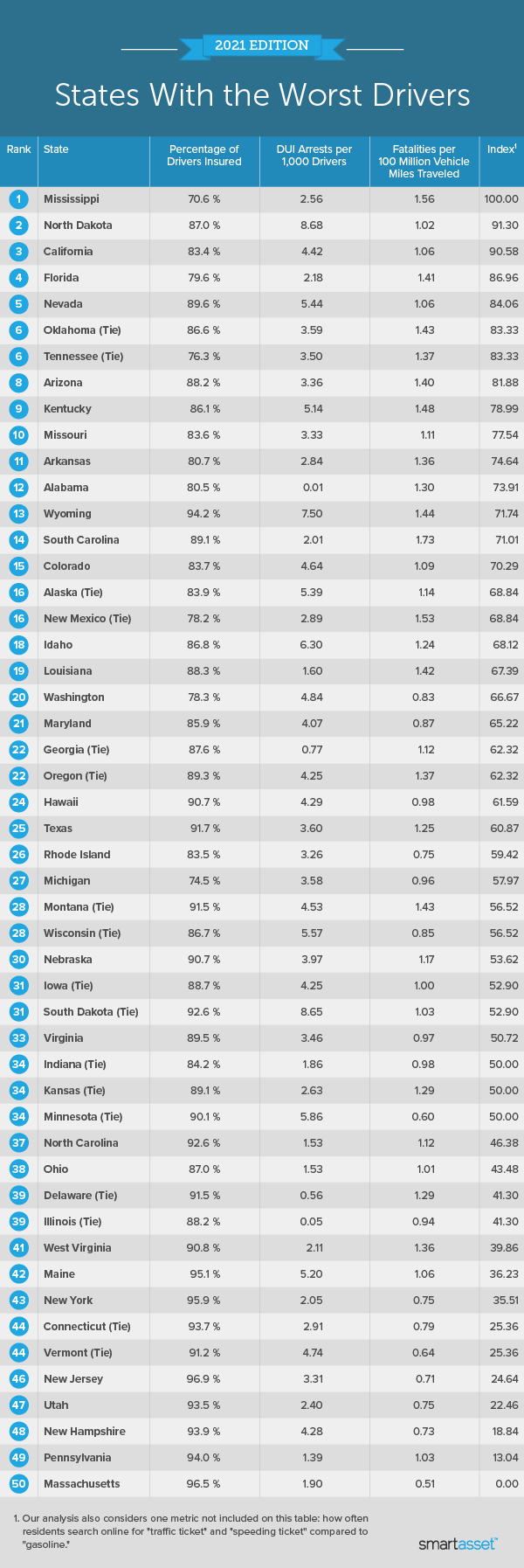 - Mississippi ranks worst, again. Mississippi may be known for its Southern hospitality, but it has the worst drivers in the country for the fourth year in a row, according to our metrics. It has the second-highest fatality rate and the absolute lowest percentage of insured drivers.