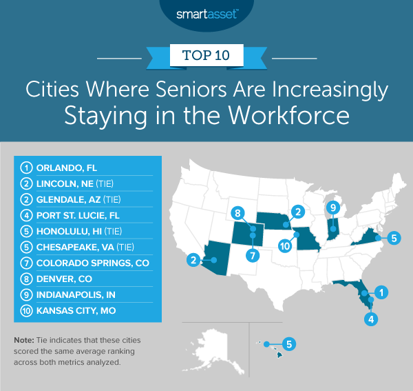 - Northeast not a popular region for working seniors. Four of the top 10 cities where seniors are increasingly staying in the workforce are in Western states, three are in Southern states and three are in Midwestern states. No Northeastern cities rank in the top 10.