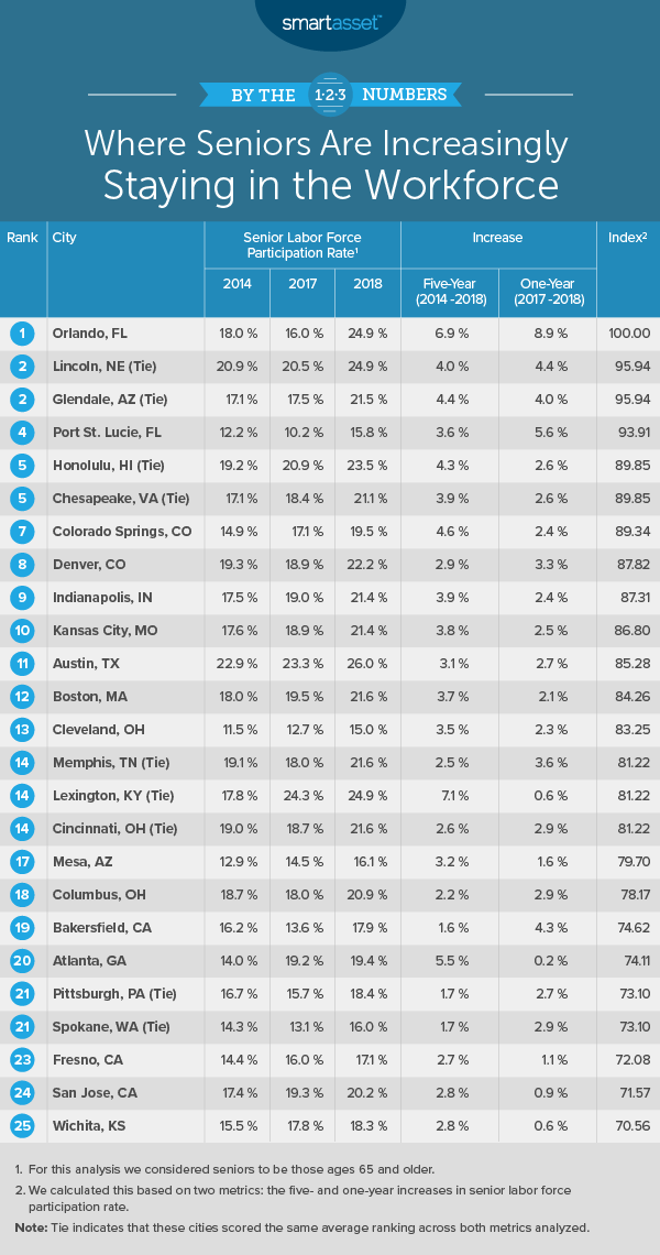 - Senior labor force participation rates have increased even more in recent years. In four of the cities in our top 10, the increase in the senior labor force participation rate from 2017 to 2018 exceeds the increase from 2014 to 2018. These cities are Orlando, Florida; Lincoln, Nebraska; Port St. Lucie, Florida and Denver, Colorado.