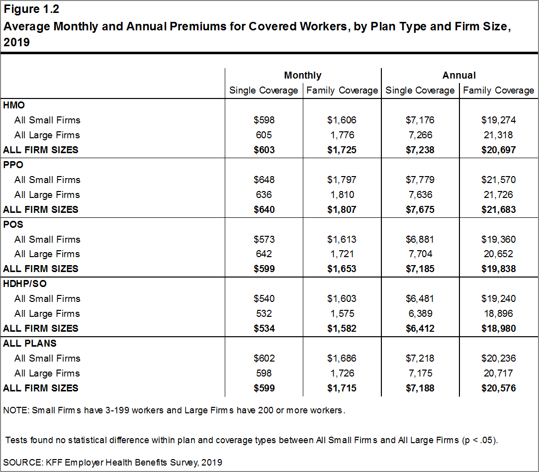 According to a 2019 survey by the Kaiser Family Foundation, the annual costs for an HMO plan for single coverage were $7,238 and $20,697 for family coverage. With the average annual cost for single coverage for a PPO plan being $7,675 and $21,683 for family coverage.