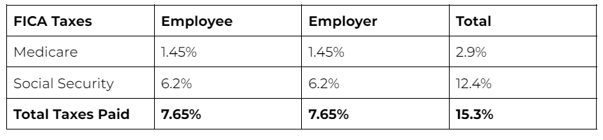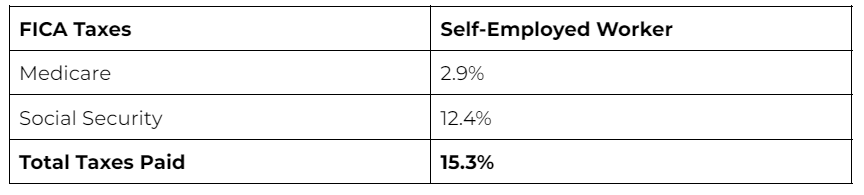 FICA taxes are the combination of Medicare and Social Security taxes. They total to make up 15.3% in taxes. If you’re self-employed you’re responsible for the entire 15.3% tax. If you’re a W-2 employee, you’re only responsible for your half and your employer covers theirs.