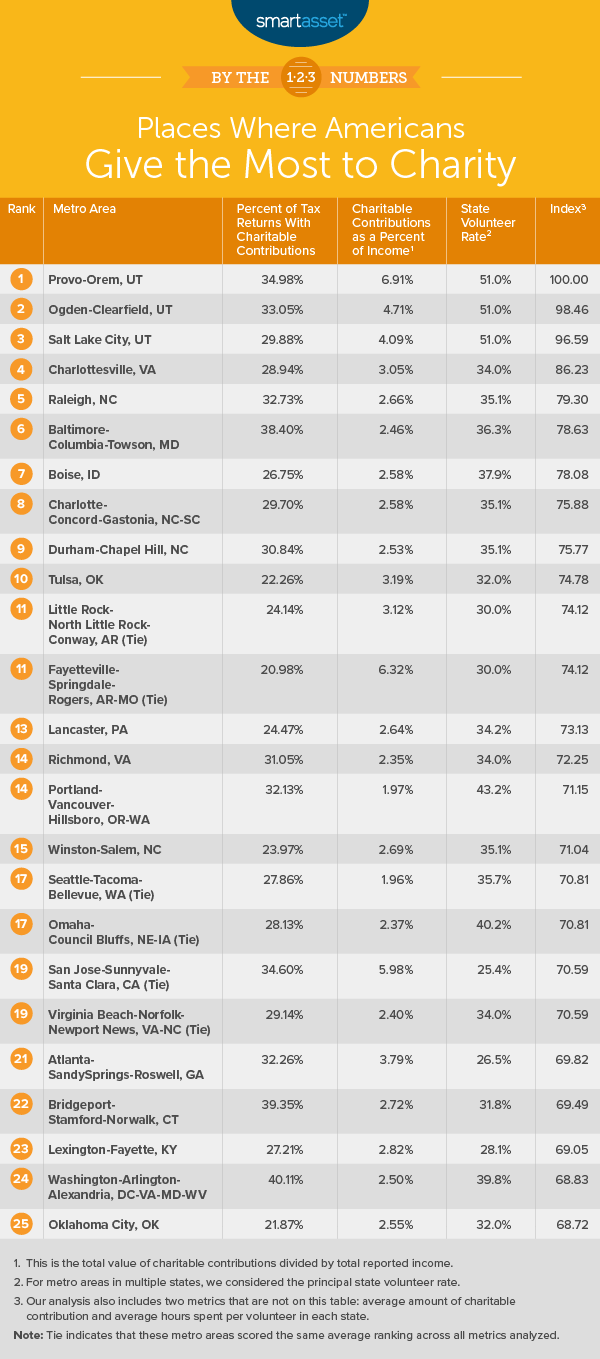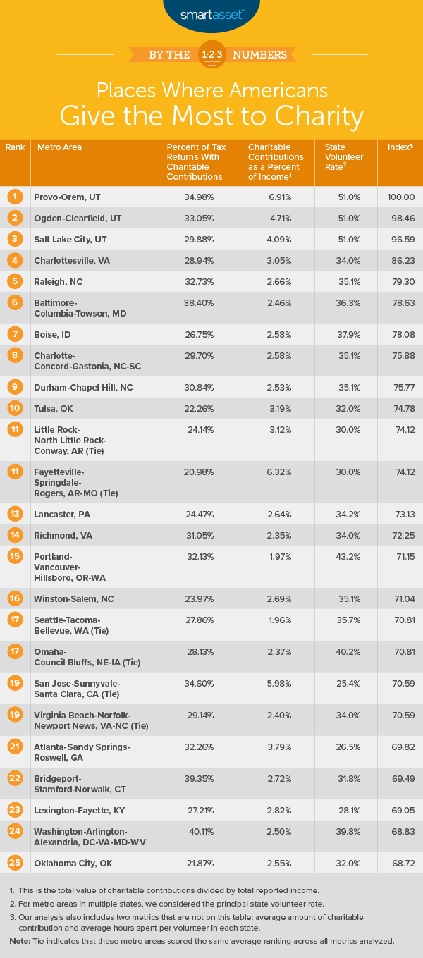 - Charitable Utah. The top three metro areas in this study are all in Utah. They all have top-10 rates for four of the five metrics we considered (except percentage of tax returns with charitable donations).