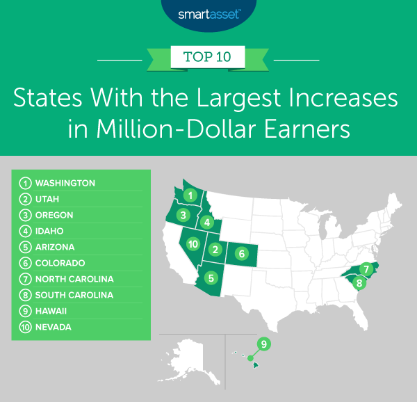 - The biggest fortunes are out West. Eight of the top 10 states in our study are located in the West, per Census Bureau designations. Million-dollar earners in Washington, Utah, Oregon, Idaho, Arizona, Colorado, Hawaii and Nevada nearly doubled from roughly 26,000 in 2013 to almost 51,100 in 2018. The only geographical outliers in the top 10 are North Carolina and South Carolina. Both states almost doubled their millionaires in five years from roughly 8,600 in 2013 to more than 15,900 in 2018.