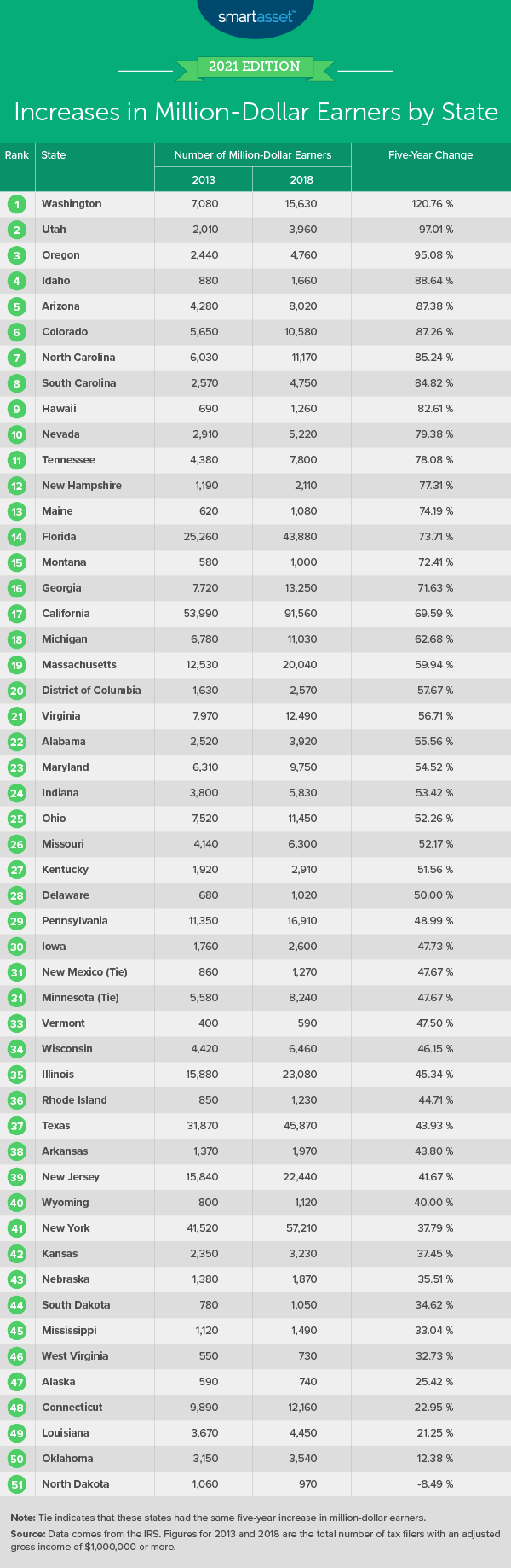Washington State claims first place, with a 120.76% increase of million-dollar earners in five years. In 2013, the state had 7,080 tax returns filed by people making at least $1 million. In 2018, that number more than doubled to 15,630.