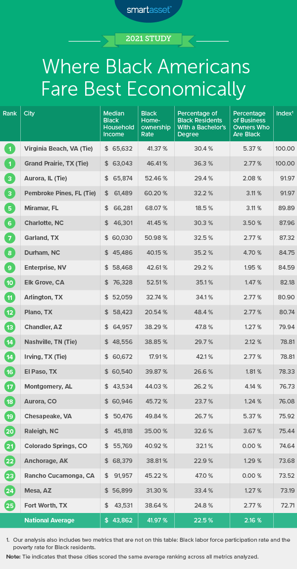Virginia Beach, Virginia ranks in the top 10 cities for four of the six metrics we considered. It has the seventh-highest median Black household income, at roughly $65,600, and the sixth-highest 2019 Black labor force participation rate, at 78.7%. Additionally, Census Bureau data shows that the 2019 poverty rate for Black residents in Virginia Beach is 10%, fourth-lowest in our study. In the Virginia Beach-Norfolk-Newport News metro area, more than 5% of businesses are Black-owned, the seventh-highest percentage for this metric overall.