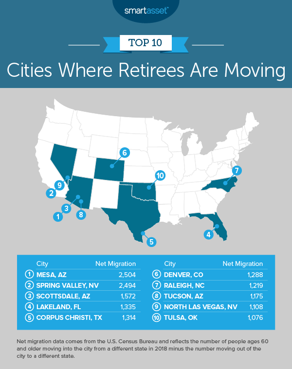 - Warm weather spots are popular. Florida and Arizona had the highest net migration of retirees in 2018. Additionally, nine of the top 10 cities where retirees are moving are located in areas of the country that are not known for frigid weather. Denver, Colorado is the only city in the top 10 known for its more severe winters.