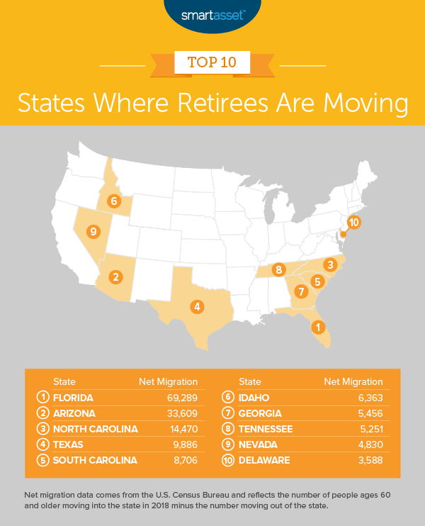 With an increasing number of retirees uprooting themselves and facing new financial realities, SmartAsset decided to look at some of the states and cities where retirees are moving to the most. Using data from the Census Bureau, we compared the number of people 60 years and older who moved into a state or city to the number of people who moved out. For details on our data sources and how we put all the information together to create our final rankings, check out our Data and Methodology section below.