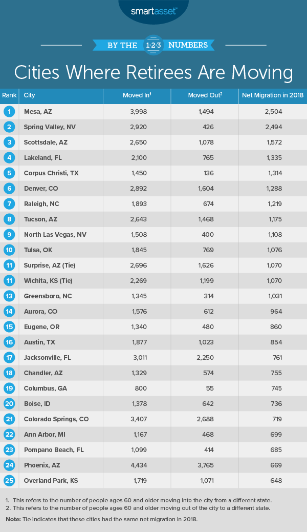 Mesa, Arizona is the No. 1 city in our study on where retirees are moving. Close to 4,000 seniors moved to Mesa in 2018 from a different state. With about 1,500 seniors moving out of Mesa to a different state, there was a net migration of about 2,500. Seniors new to the area may want to take a look at our list of the top financial advisors in Mesa.