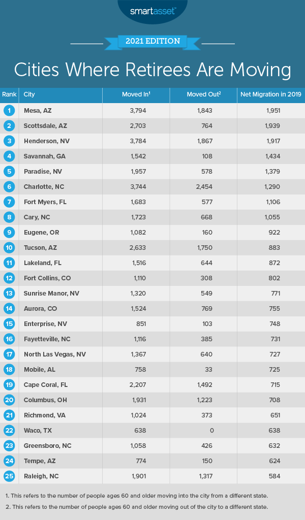 North Carolina, South Carolina and Texas follow Florida and Arizona as popular destinations to which retirees are moving. Census data shows that there was a net migration of roughly 19,700 people aged 60 and older to North Carolina in 2019, while South Carolina had about 14,000 and Texas had just over 9,300.