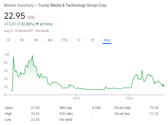 As of August 2024, DJT shares traded around $23 — for a market cap of about $4.5 billion — and reporting has ranged widely regarding Trump’s ownership in this company. At the low end the Associated Press reported in March that he owns around 79 million shares, which would make Trump’s stake in his namesake media group worth roughly $1.82 billion. At the high end, in his most recent financial disclosure Trump reported owning 114,750,000 shares in this company. If so, this would make his shares of DJT worth approximately $2.64 billion (114,750,000 * 23).
