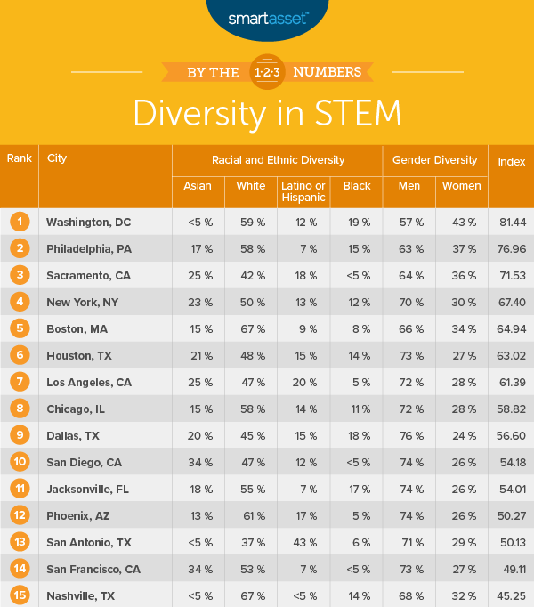 Some cities are doing better than others when it comes to diversifying their STEM workers. To find where there is the most diversity in STEM workfaces, SmartAsset took a look at the racial and gender breakdown of STEM workers in cities across America. For details on our data sources and how we put the information together to create our final rankings, check out the Data and Methodology section below.