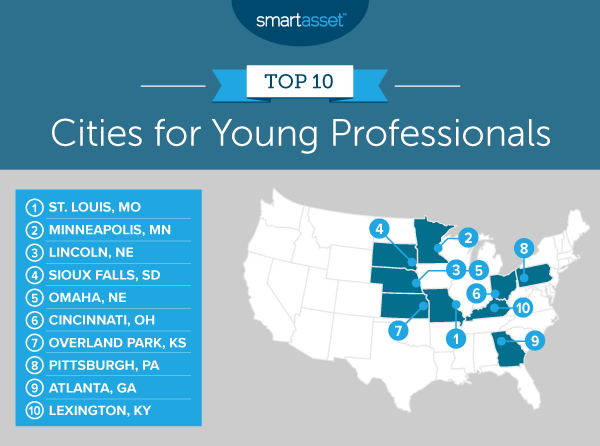 - Midwestern cities prove strong contenders for young professionals. If you’re at the start of your career and looking to move, consider the middle of the country, not the coasts. Seven of the top 10 cities in our study are in the Midwest, according to Census regional divisions. They stand out in two metrics in particular: median rent as a low percentage of full-time workers’ earnings and a high percentage of the population between 25 and 34.