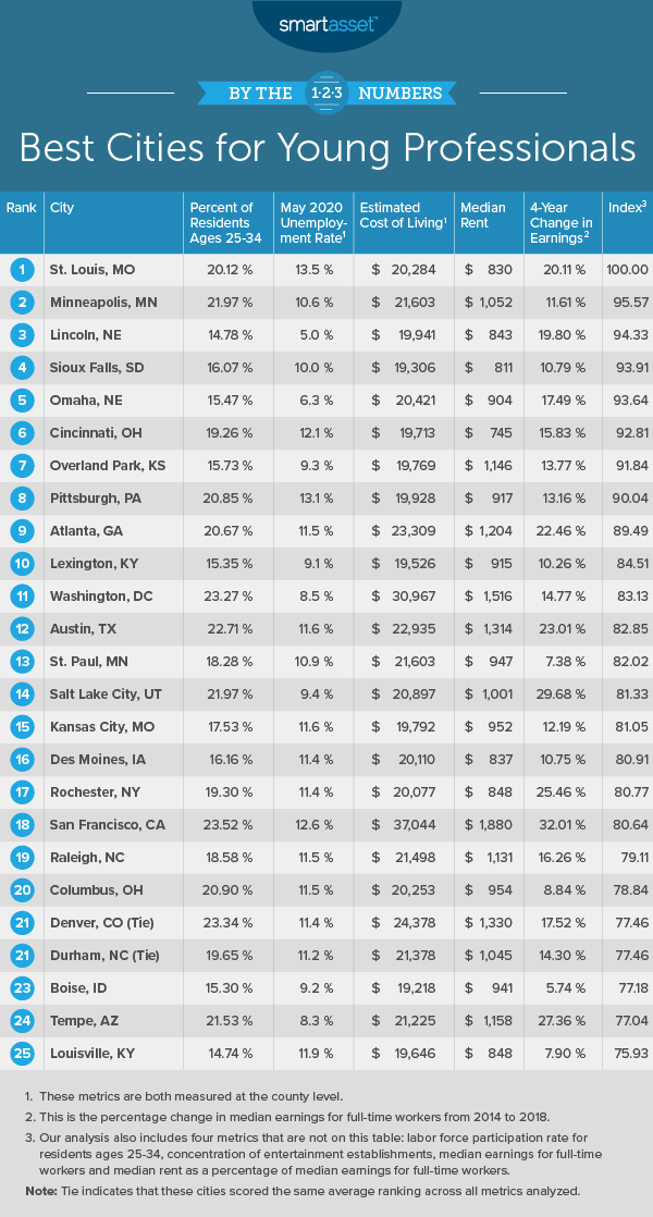 We considered 150 cities, comparing them across the following metrics: percentage of the population between 25 and 34, county level unemployment rate from May 2020, labor force participation rate for young professionals, median rent, cost of living, density of entertainment establishments, median earnings for full-time workers, four-year change in median earnings and median rent as a percentage of full-time workers earnings. For details on our data sources and how we put all the information together to create our final rankings, check out the Data and Methodology section below.