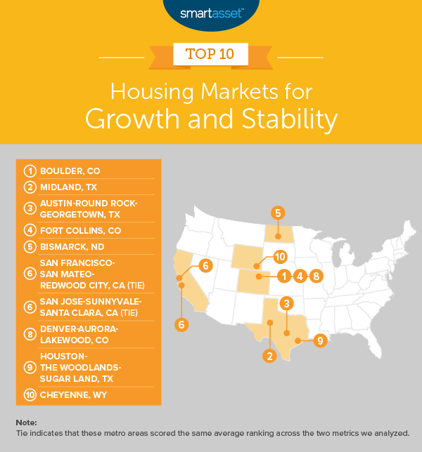 - Stability stays the course. Seven of the metro areas that cracked our 2018 top 10 also make it into our 2019 top 10. Billings, Montana; Grand Forks, North Dakota-Minnesota and Casper, Wyoming dropped this year to 12th, 15th and 27th respectively from 8th, 7th and 6th last year. San Francisco and San Jose, California rose this year to tie at 6th this year from 13th and 15th last year, respectively. A stable housing market requires years of consistent performance, so it’s not unusual that places repeat year after year.