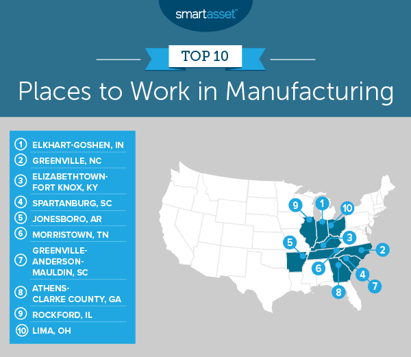 - The Midwest and South rank well. Of the top 10 places to work in manufacturing, three are in the Midwest, and the remaining seven are in the South. Moreover, there are 11 Midwestern states and 11 Southern states in the top 25. The metro areas in these regions excel at job growth and income growth for manufacturing workers.
