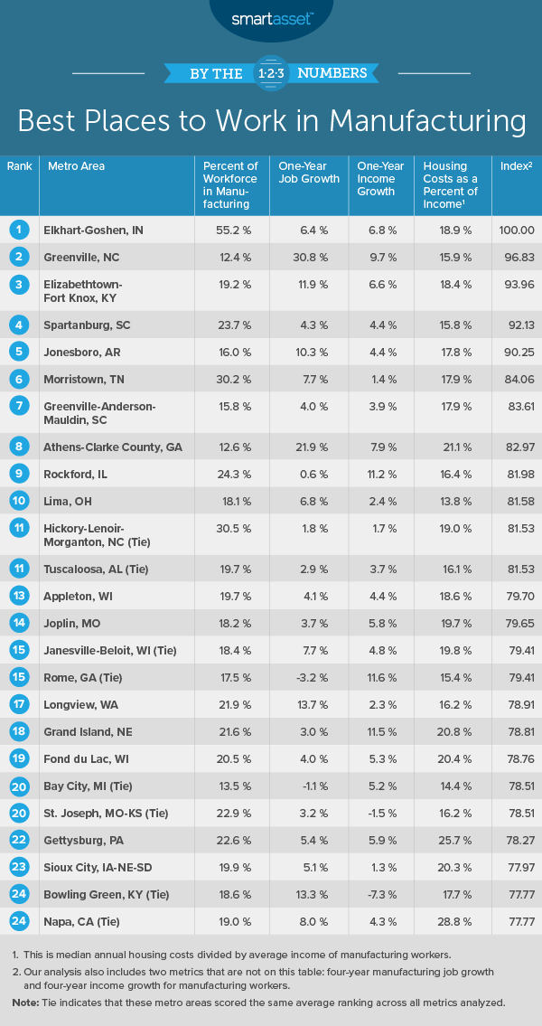 In this study, we examined the best places to work in manufacturing by considering the percentage of the workforce employed by the manufacturing industry, job and income growth and how average incomes compare to median annual housing costs in each metro area. For more information on our data sources and how we put all the information together to create our final rankings, check out the Data and Methodology section below.