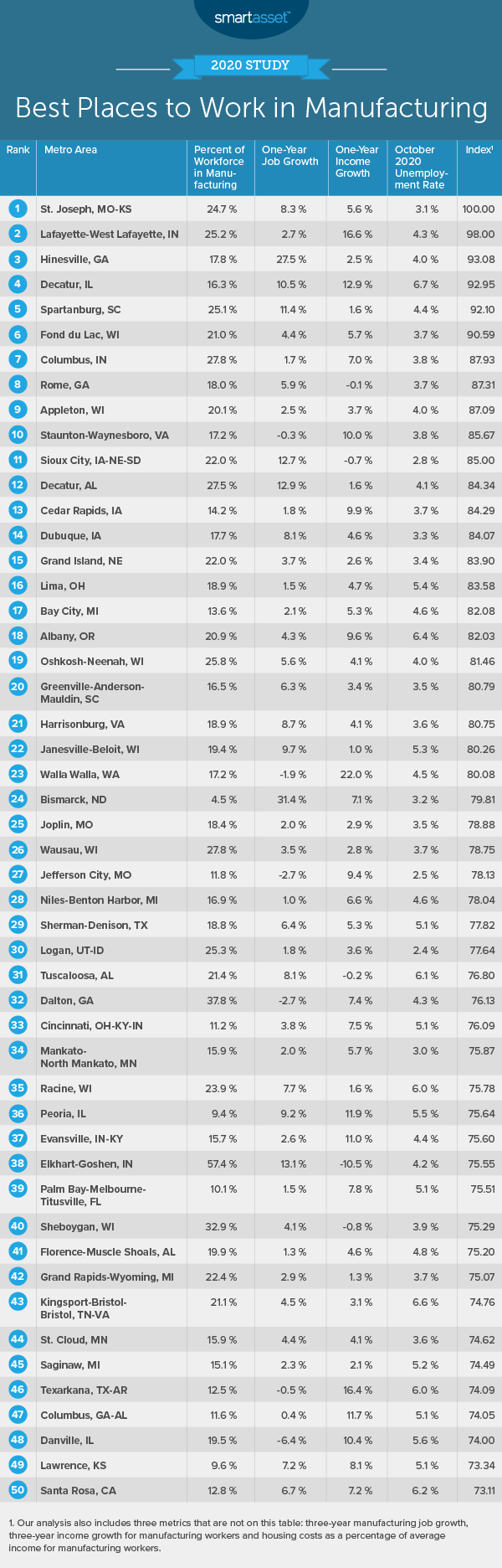 Manufacturing has a special place in the American story, but for the past few decades, this sector has been largely on the decline, impacting many workers and affecting decisions around things like budgeting and where they call home. Since 1997, more than 91,000 manufacturing plants have closed and almost 5 million manufacturing jobs have been lost, according to a 2020 study from the Economic Policy Center. Still, there are jobs to be had and careers to be built in the world of manufacturing in the U.S., provided you are looking in the right places. To that end, SmartAsset analyzed various data to find the best places to work in manufacturing in 2020.