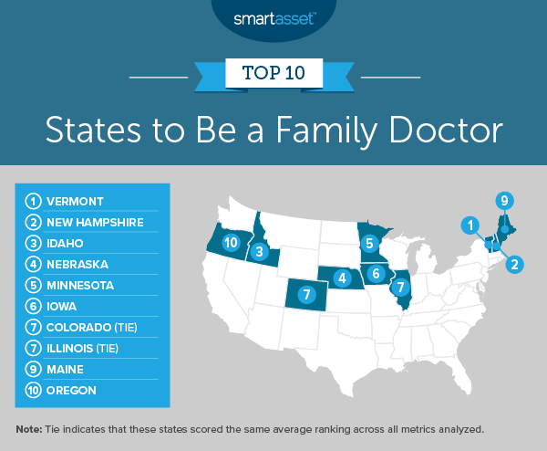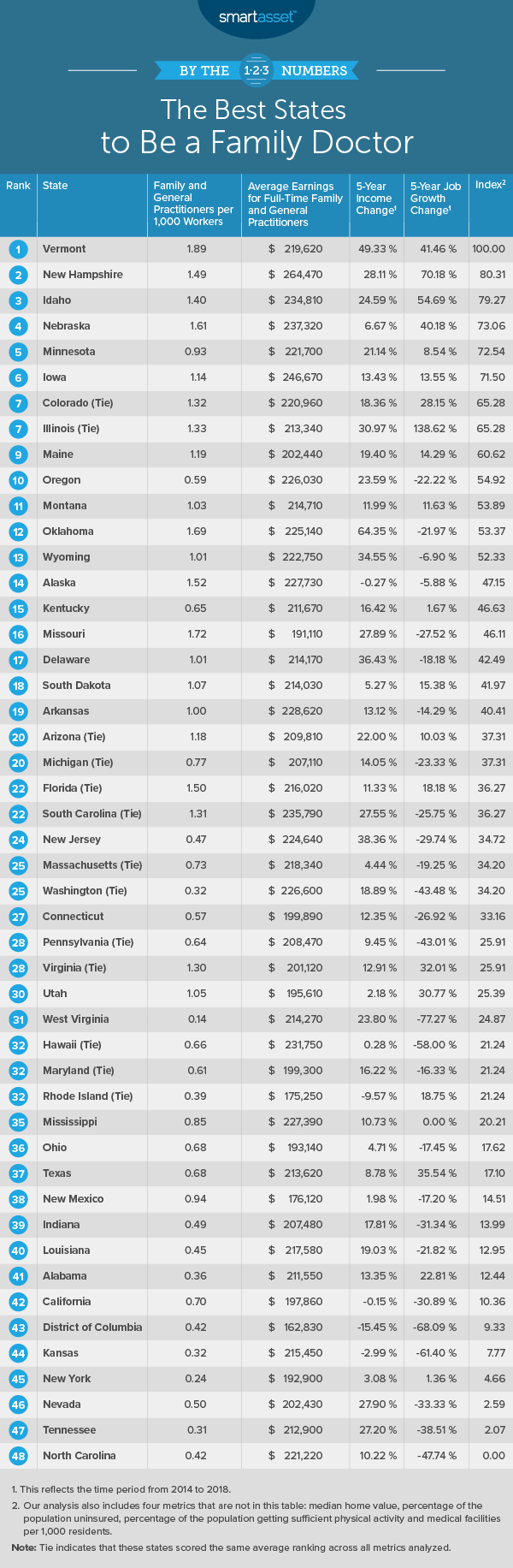 In this study, SmartAsset looked at the best states for family doctors according to eight metrics that span job-specific data to home affordability and medically related community demographics. They include the number of family and general practitioners per 1,000 workers, average annual income, five-year earnings and job growth, median home value, percentage of the population without health insurance, percentage of residents getting sufficient physical activity and the number of medical facilities per 1,000 residents. For details about data sources and how we put all the information together to create our final rankings, check out the Data and Methodology section below.