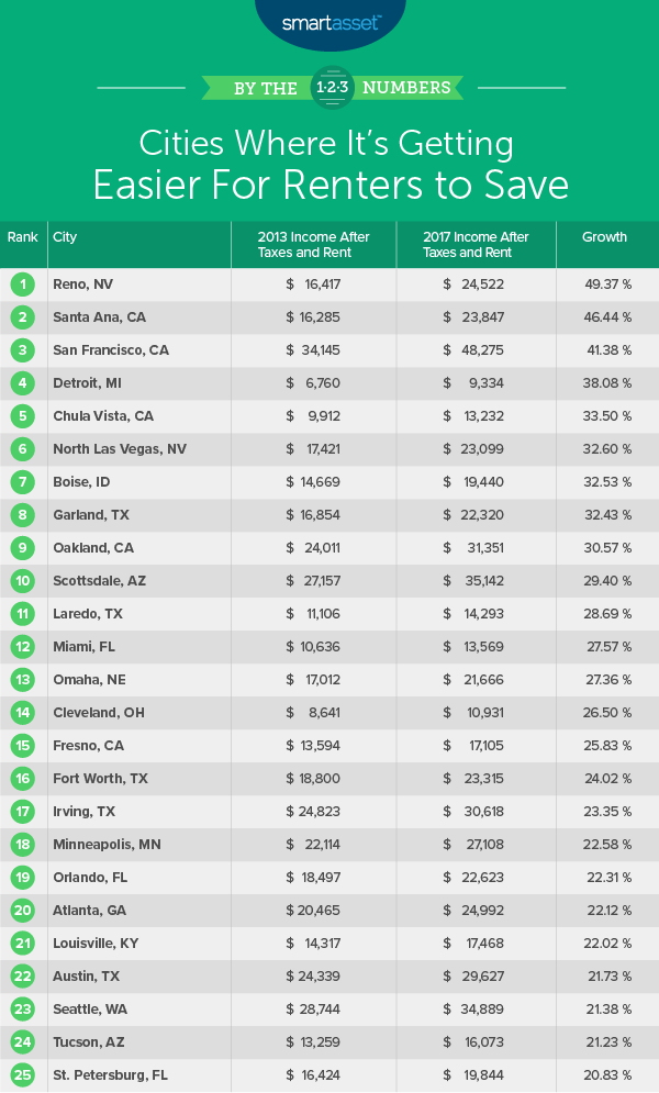 To find the cities where it’s getting easier for renters to save, SmartAsset determined the median income after taxes and rent payments for 100 of the largest cities in the country in both 2013 and 2017, and then calculated the percentage change. To find our results, we took the median income for a city minus estimated taxes on that income and average annual rent. The sources for our data are as follows:
