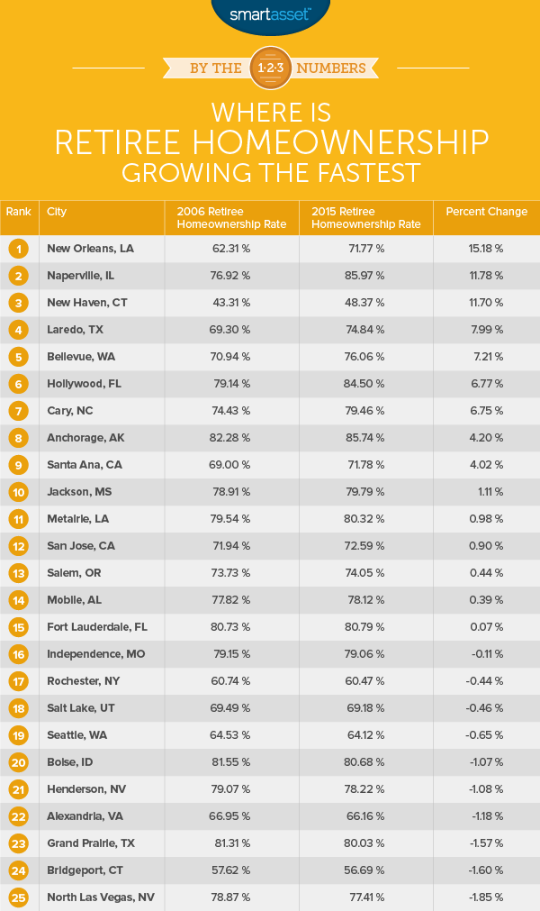 We used those two metrics to find the percent change between the 2006 retiree homeownership rate and the 2015 retiree homeownership rate. We then ranked the cities by biggest change in percent growth to lowest change in percentage growth.