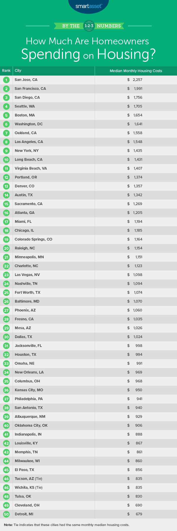 The top of this list is San Jose, California, right in the heart of Silicon Valley. All that tech money in the area is one factor that has contributed to high housing costs. Average monthly housing costs for homeowners in San Jose total $2,257.