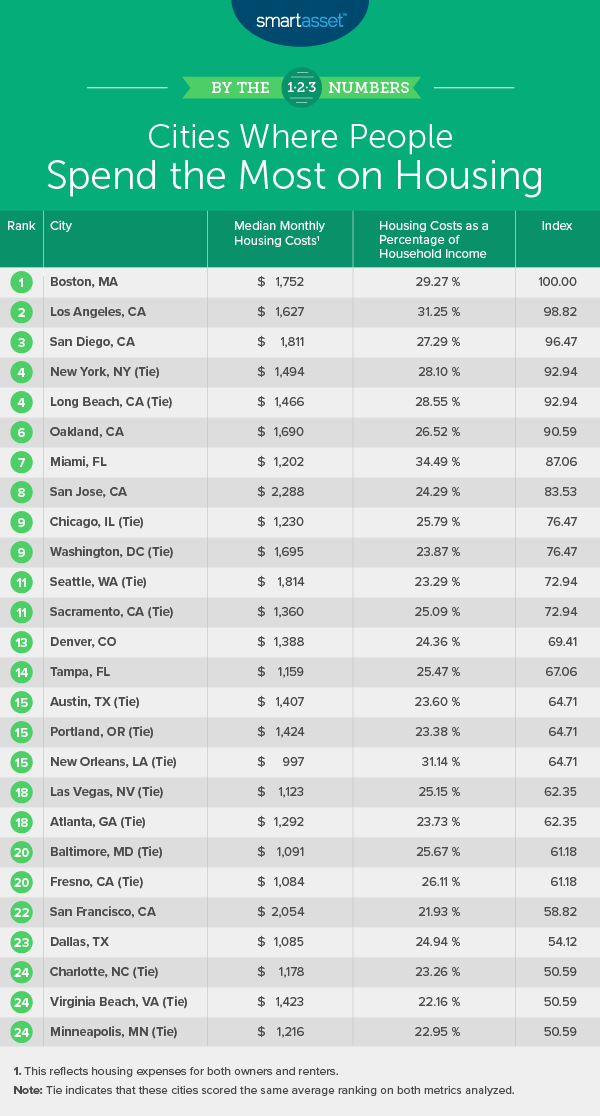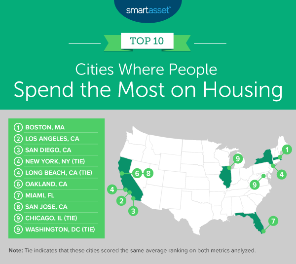 To find where people spend the most on housing, SmartAsset looked at data on the 50 largest U.S. cities across the following two metrics: median monthly housing costs and housing costs as a percentage of income. For details on our data sources and how we put all the information together to create our final rankings, check out the Data and Methodology section below.