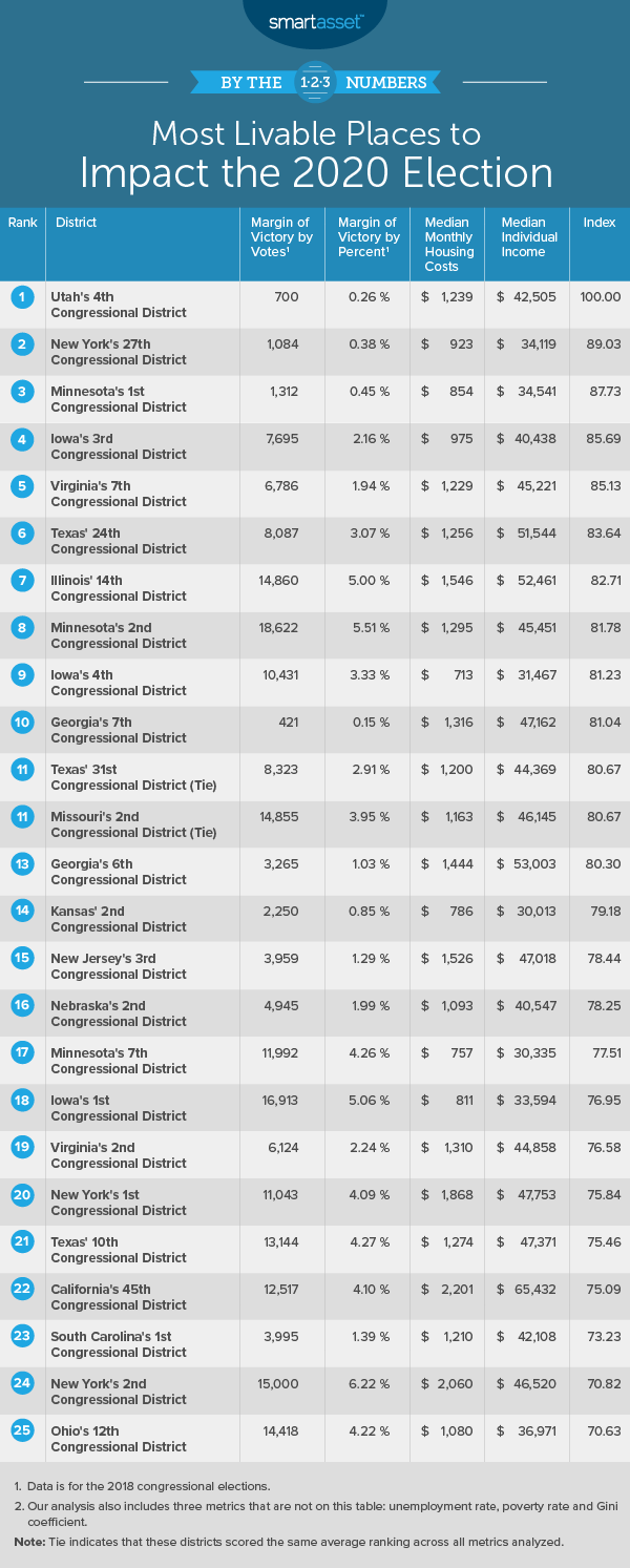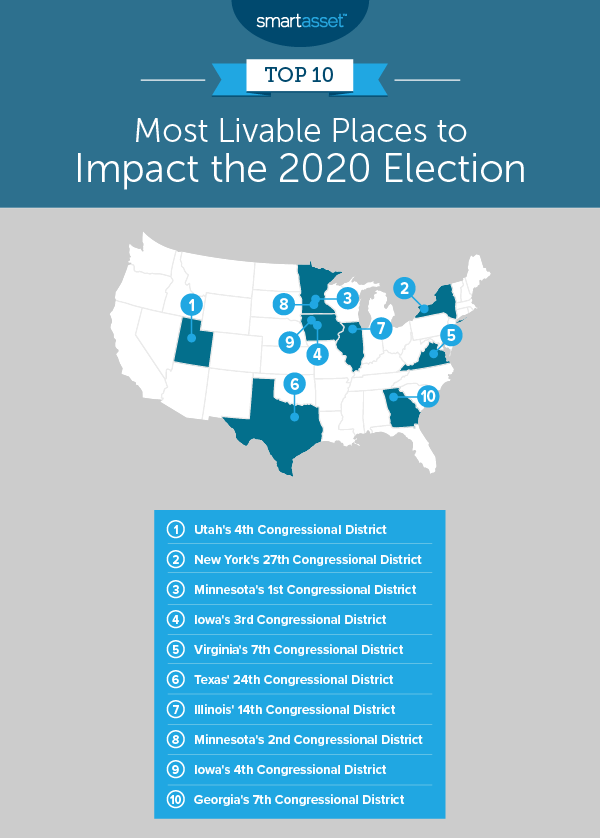 - Livable swing districts in the Midwest. Half of the top 10 livable places to impact the 2020 election are located in the Midwest. Specifically, two of the congressional districts are in Minnesota, two are in Iowa and one is in Illinois.