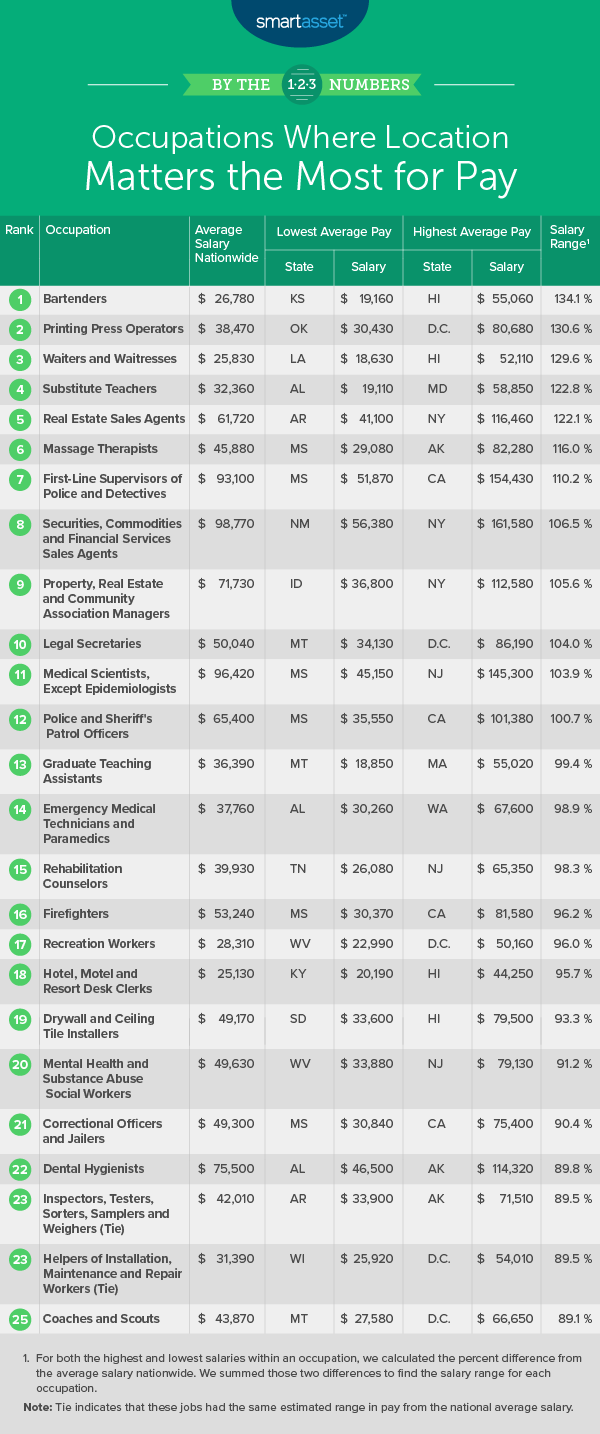 To find the occupations where location matters the most for pay, SmartAsset looked at employment data from 2018 on both the national and state level for all 50 states as well as the District of Columbia. Considering only occupations with more than 100,000 workers nationally and filtering out occupations with “other” or “miscellaneous” in the title due to lack of specificity, we compared the maximum and minimum average state salaries for each occupation to the national salary for that occupation. Specifically, for both the highest and lowest salaries within an occupation, we calculated the percentage difference from the average salary nationwide. We summed those two differences to find the salary range for each occupation. We then sorted occupations according to this range, with occupations with the largest ranges ranking the highest.