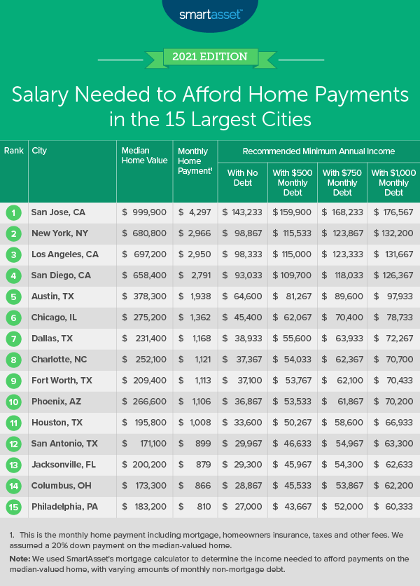 Housing costs eat up more of the average American’s salary each month than any other single expense, reaching about one third of average expenditures in 2019, according to data from the Bureau of Labor Statistics. And while homeownership is coded into the DNA of the American Dream, buying a home isn’t easy for many. Car payments, student loans, credit card bills and other debts can make it difficult to qualify for a home loan and keep up with mortgage payments. That’s why SmartAsset analyzed data from the 15 biggest U.S. cities to estimate how much money you will need to make – and not exceed the recommended 36% debt-to-income ratio – to afford monthly home payments.