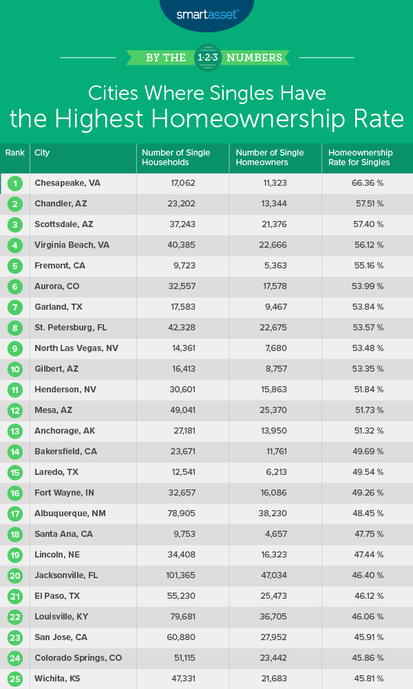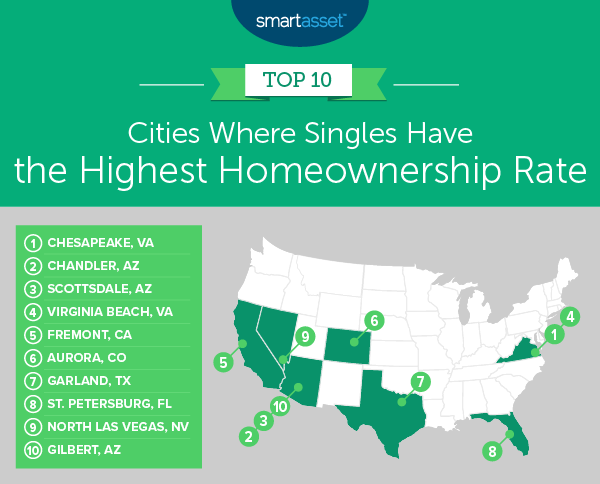 Using data on the largest 100 cities, SmartAsset created this ranking of the cities where singles have the highest homeownership rates. We considered two factors: