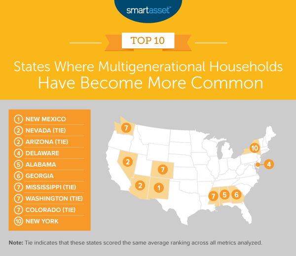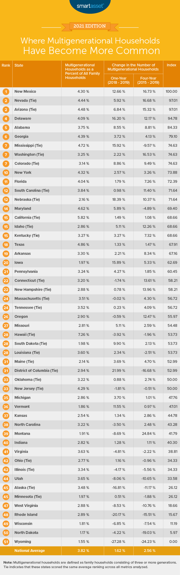 To find the states where multigenerational households are becoming more common, SmartAsset looked at data for all 50 states and the District of Columbia across the following three metrics: