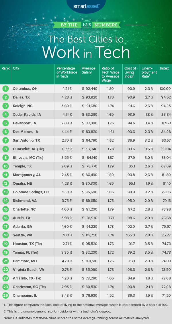 Tech jobs are in high demand across the country. The positions pay well, the companies often offer great benefits and your work helps to create products and services that run the world. While you might think that you have to live in New York or the Bay Area to work in tech, there are actually a lot of cities with great career opportunities for tech workers without the high cost of living that comes with being a resident of those major coastal cities. Snagging a job in a place with a more affordable mortgage can be a strategic way to help your tech salary go further. So for the sixth year in a row, SmartAsset takes a look at the best American cities to work in tech.