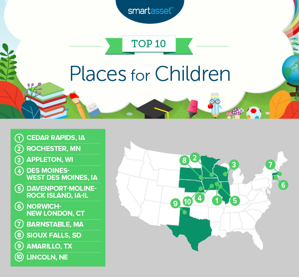 - Iowa stubborn. Of the top five best places for children in 2019, Iowa doggedly has three metro area representatives. They are Cedar Rapids and Des Moines-West Des Moines, as well as Davenport-Moline-Rock Island, which falls between Iowa and Illinois.