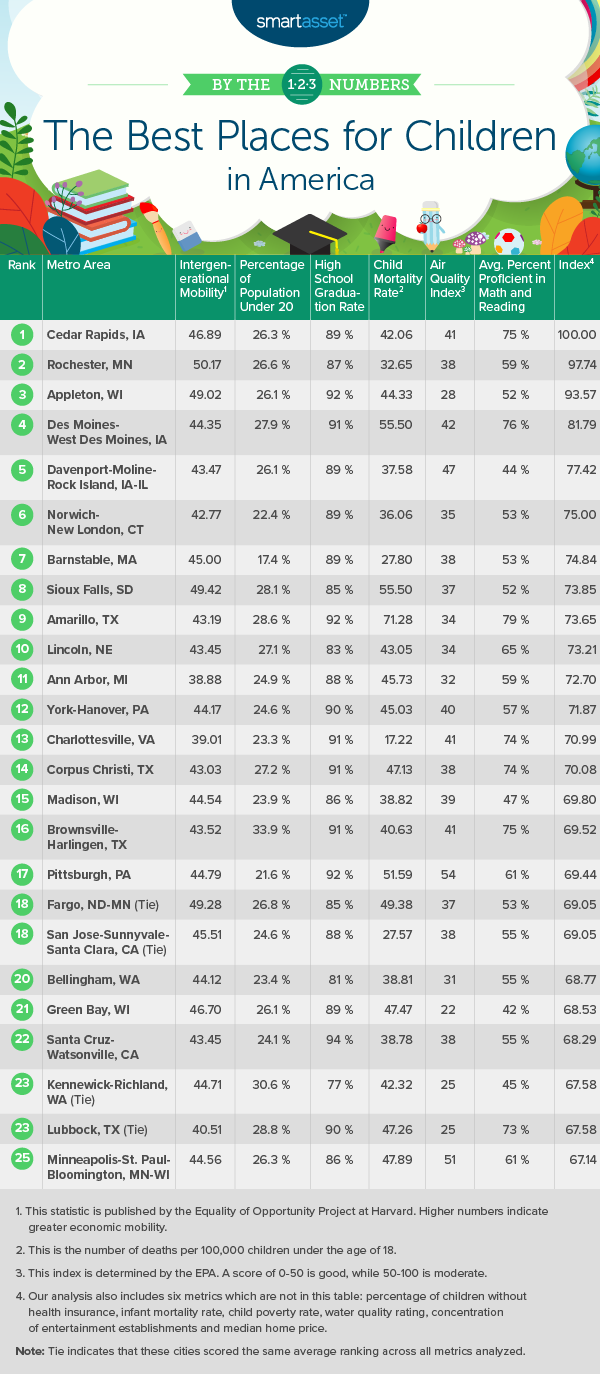 In order to determine some of the best places in the U.S. for children, we looked at data for 194 metro areas across 13 metrics, spanning a range of topics like affordability, entertainment, school quality and environment. Check out the Data and Methodology section below for more information on our data sources and how we put together our final rankings.