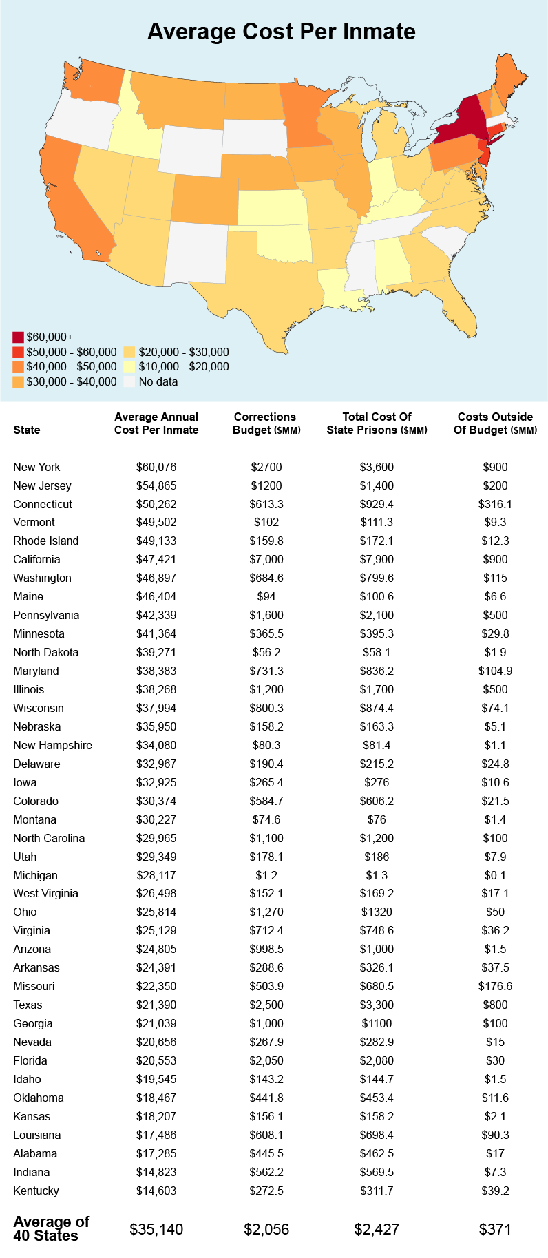 The average cost of incarcerating an American prisoner varies from state to state. Some states, like Indiana have managed to keep prices low at around $14,000 per inmate. While states like New York pay around $60,000 to keep its citizens behind bars. The costs of running the American prison system is expensive and has become increasingly so despite public opposition.