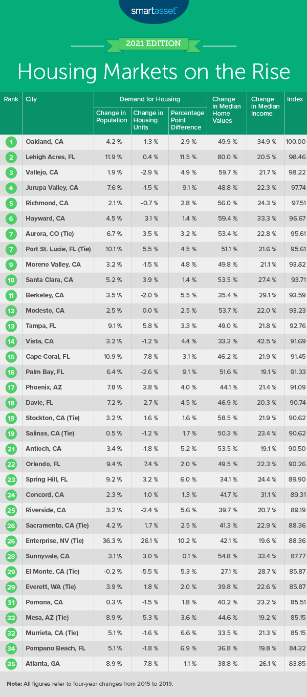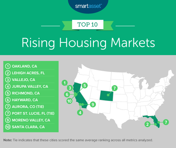 - California is home to the most rising housing markets. Seven California cities rank in the top 10 of this study. These include Oakland, Vallejo, Jurupa Valley, Richmond, Hayward, Moreno Valley and Santa Clara. All seven cities rank within the top 10% of the study for their high four-year changes in median home value (almost 54% on average). Golden State cities also dominate beyond the top 10, as 20 out of the top 35 rising housing markets are in California.