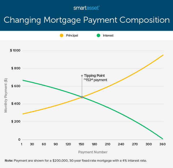 In the example above, the tipping point is about 13 years; only on the 153rd payment will more of the monthly payment go toward the principal than interest. We can see how the composition of mortgage payments changes over time for a $200,000 30-year fixed-rate mortgage with a 4% interest rate in the chart below.