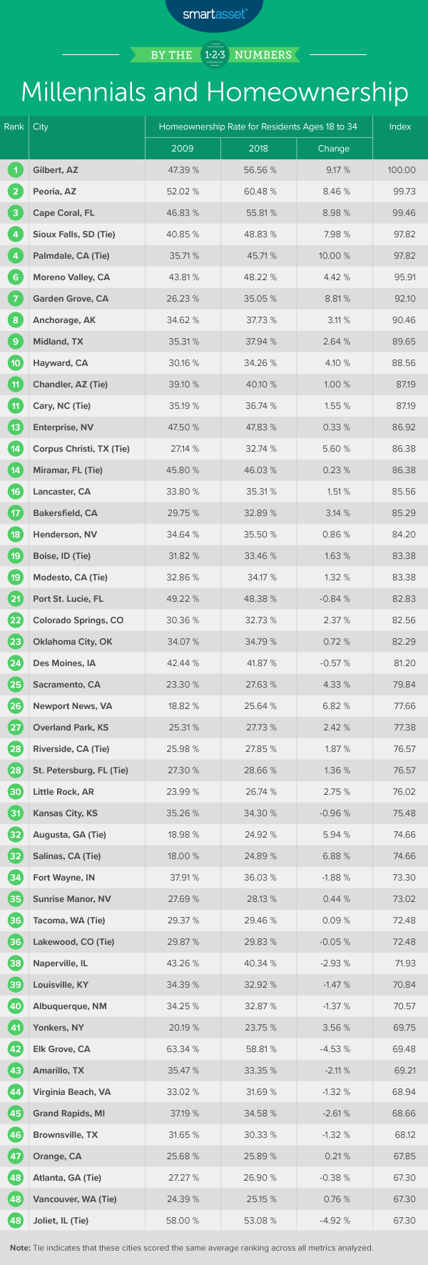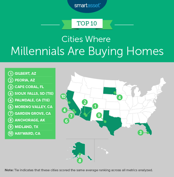 - Millennial homeownership rates are higher in the West. Seven of the top 10 cities in our study are in the West, with two in Arizona, four in California and one in Alaska. All seven cities have millennial homeownership rates that rank in the top 20% of cities in our study.