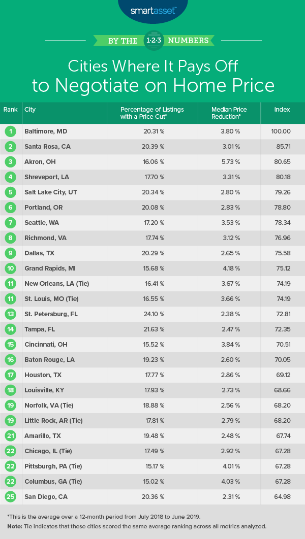 Santa Rosa, California ranks as the second-best city to negotiate on a home, with comparable figures to the No. 1 city of Baltimore. Between July 2018 and June 2019, an average of 20.39% of home listings had price reductions, and the median price reduction for those listings month-over-month was 3.01%.