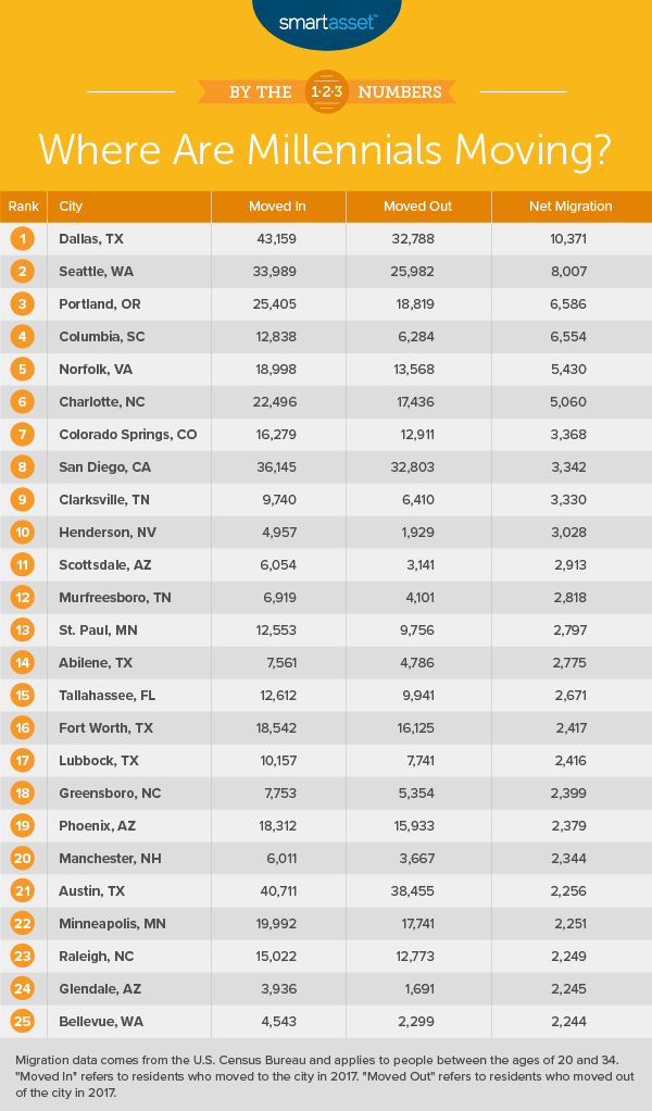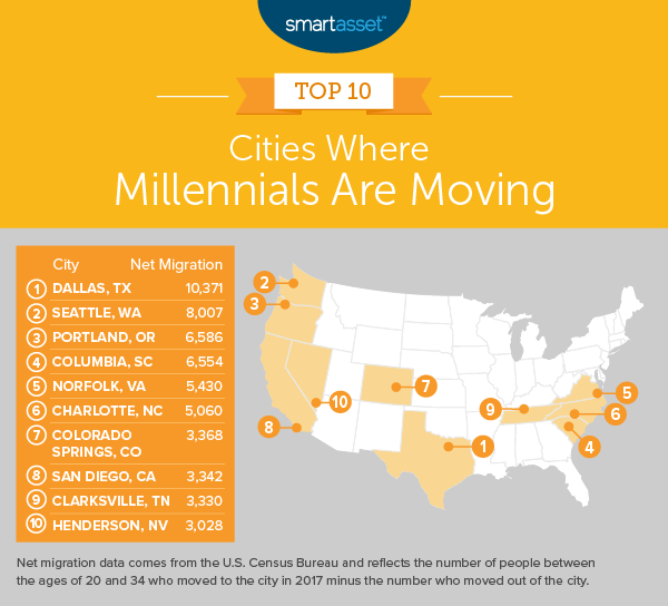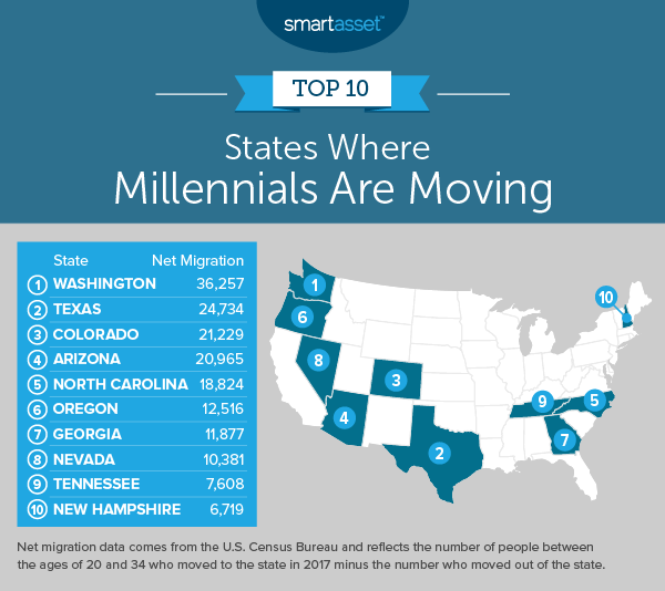To calculate which cities and states millennials are moving into, SmartAsset compared 2017 Census Bureau migration data for 173 cities and all 50 states, as well as Washington, D.C.