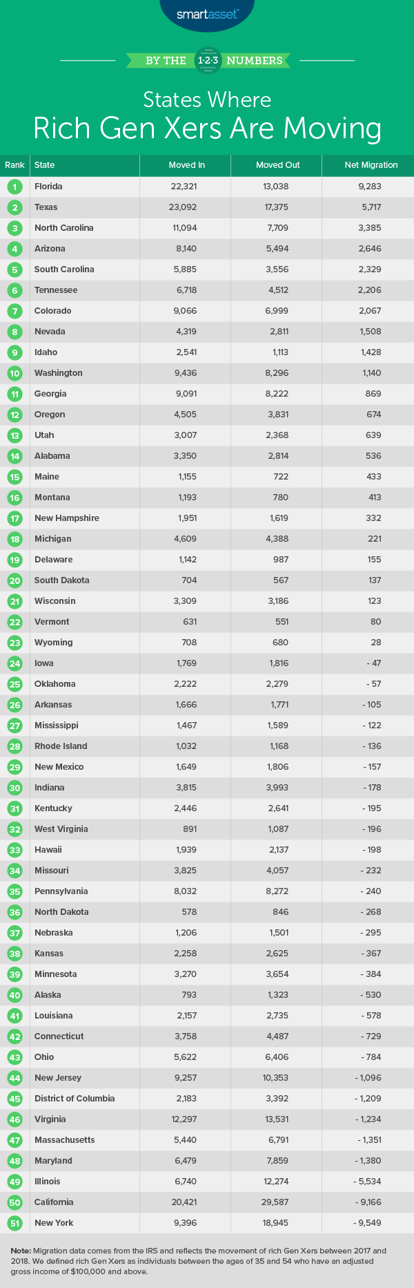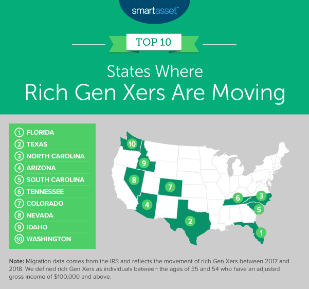 - Rich Gen Xers are flying South. Five states in our top 10 are in the South: Florida, Texas, North Carolina, South Carolina and Tennessee. In these top-ranking Southern states, tax filers between the ages of 35-54 making at least $200,000 comprise at least one-fourth of the net migration of rich Gen Xers.