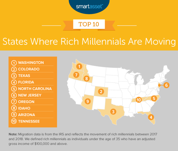 - Western and Southern states are popular. Half of the top 10 states where rich millennials are moving are in the West, according to Census regional divisions. They include Washington, Colorado, Oregon, Idaho and Arizona. There was a net migration of more than 500 rich millennials to all five states between 2017 and 2018. Furthermore, four other states in the top 10 are in the South: Texas, Florida, North Carolina and Tennessee.