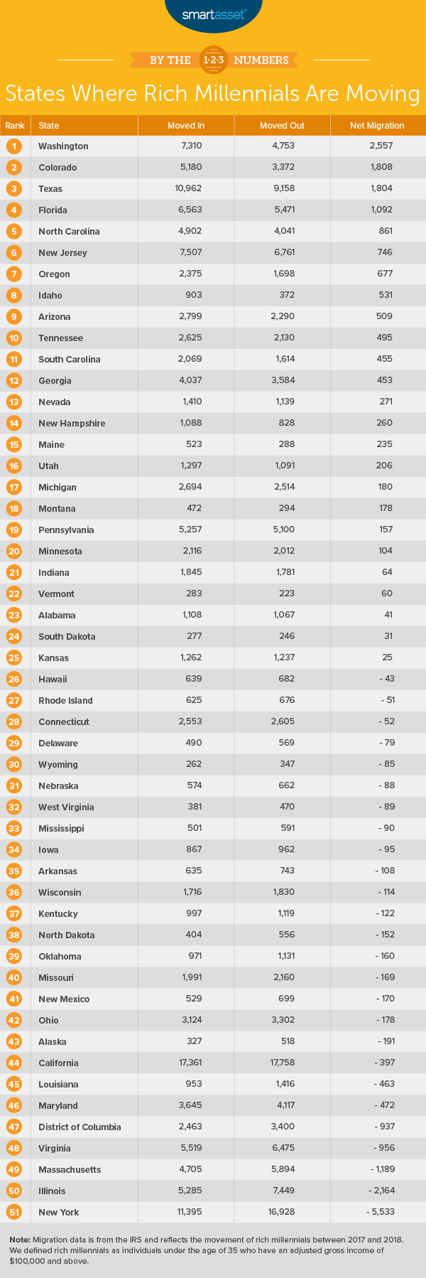 In this study, SmartAsset looked specifically at the movement of rich millennials, defined as individuals younger than age 35 with adjusted gross incomes (AGIs) of at least $100,000. We considered the inflow and outflow of rich millennials from each state between 2017 and 2018 to determine the states where rich millennials are moving the most. For details on our data sources and how we put all the information together to create our final rankings, check out the Data and Methodology section below.