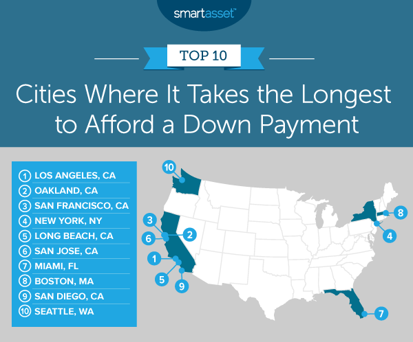 It will take residents in Los Angeles, California the longest to save for a down payment. The median home value is $697,200, which means that they will need to save $139,440 for a 20% down payment. If a person earns the median household income of $67,418 and saves 20% of that each year, then he or she will need to work 10.34 years to have enough money to afford a down payment.