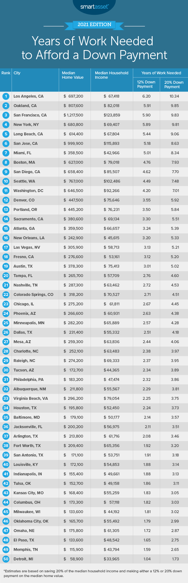 This is SmartAsset’s fifth look at how many years of work it takes to afford a down payment. You can read the 2020 edition here.