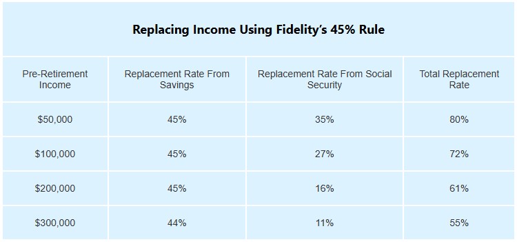 Fidelity’s 10x rule of thumb is a nifty guideline to follow as you save for retirement over the course of many decades. But when retirement arrives, Fidelity recommends that your savings should cover 45% of your income needs, with Social Security covering the rest. As a result, the average retiree will need to replace between 55% and 80% of his pre-retirement, pretax income to maintain his current lifestyle.