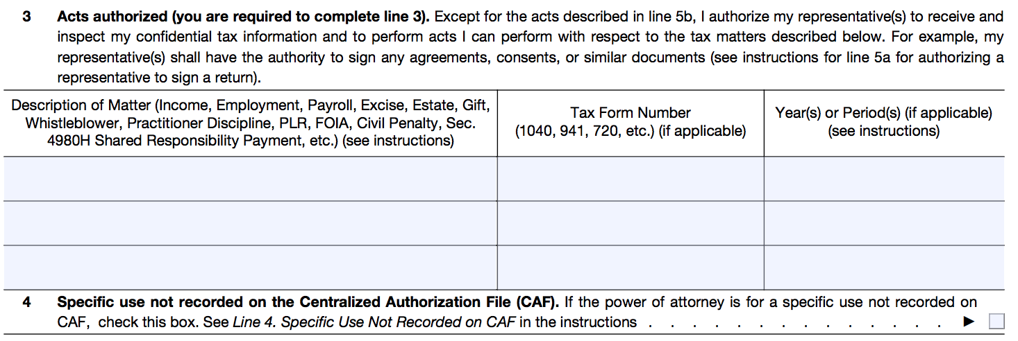 Line 3 asks you to list the tax matters that you authorize your representative(s) to address. You’ll need to describe each issue, the tax form that it appears on and the appropriate year or period of time. Unless you say otherwise, your representative can talk to the IRS about anything related to interest, income tax payments and penalty charges.