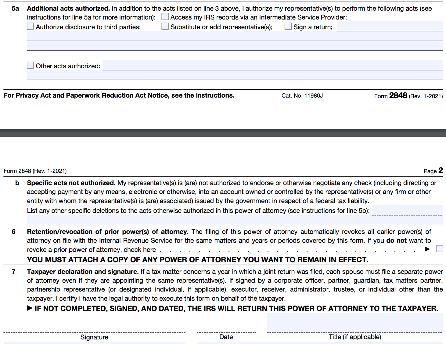 Form 2848 does not give representatives free rein to do whatever they want, however. They can’t do anything you haven’t given them the authority to do. They are also prohibited from trying to persuade the government to give you a tax refund check.