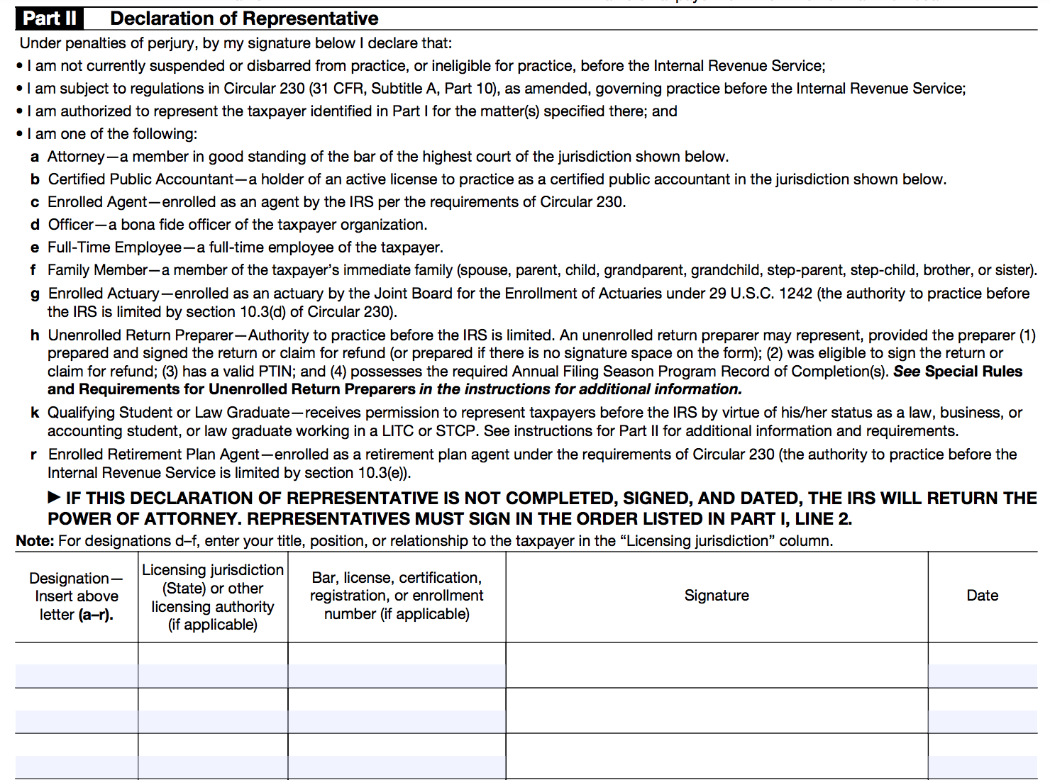 The person who has agreed to represent you will fill out Part II of the form. He or she will need to choose the letter (from a list) that corresponds to their relationship to you. For example, they will need to put a “b” if they are a certified public accountant and an “f” if they are a member of your family. They will also need to provide additional details about their licensing jurisdiction and license/certification number. The final requirement requirement is their signature.