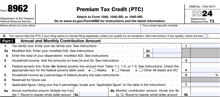 You’ll also enter your household income as a percentage of the federal poverty line. Consult the table in the IRS Instructions for Form 8962 to fill out the form. By the end of Part I, you’ll have your annual and monthly contribution amounts (lines 8a and 8b).